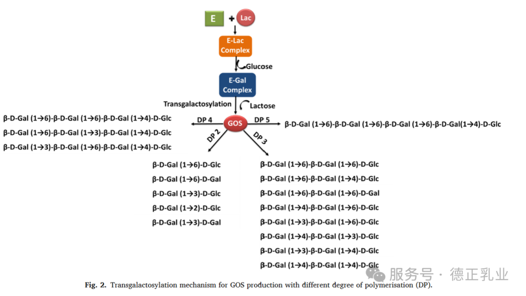 (图 2)展示了低聚半乳糖(GOS)的 “转半乳糖基化” 生产机制,以及不同聚合度的 GOS 产物结构。