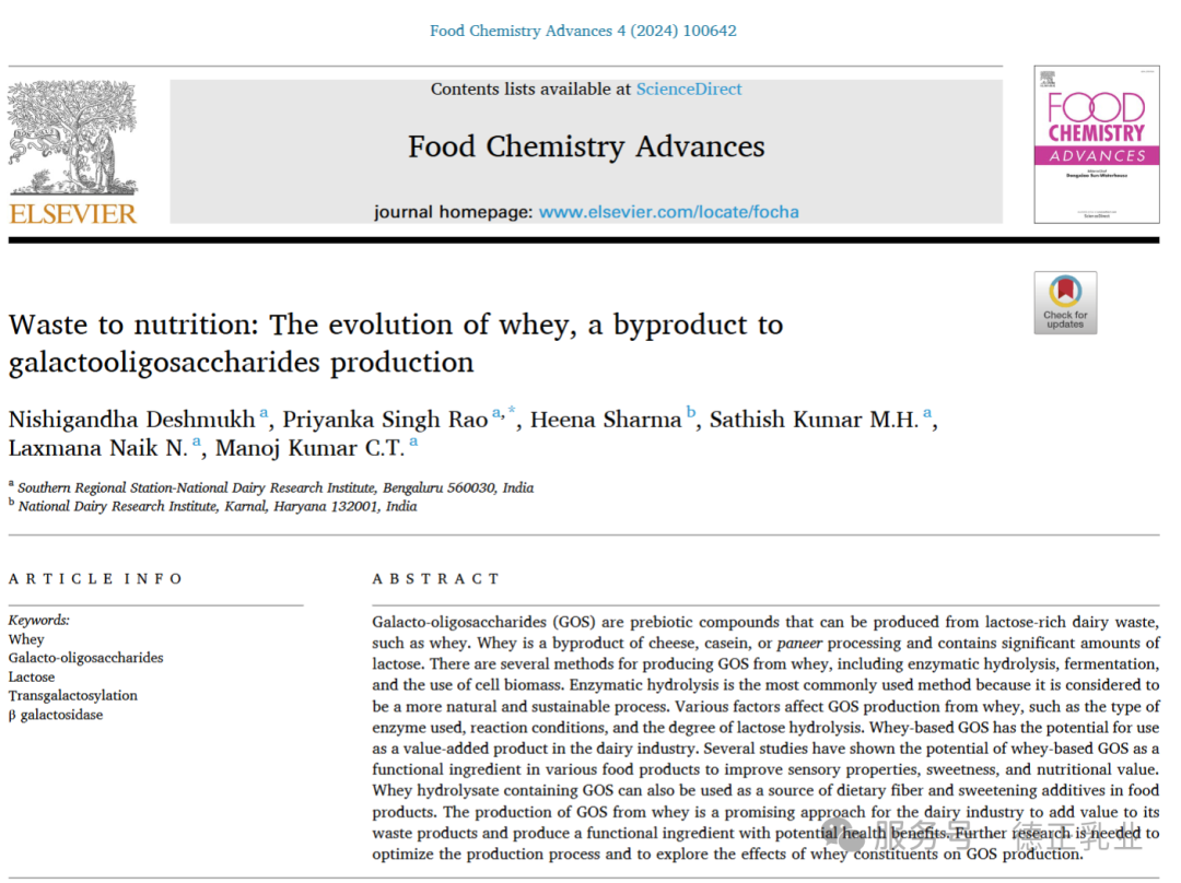 先搞清楚两个关键东西:乳清和 GOS。乳清是做奶酪、酸奶、 paneer(一种印度软奶酪)时剩下的淡绿色透明液体,里面有乳糖、矿物质、少量蛋白质这些营养,但以前很多都直接当废水排了,不仅浪费,还因为污染物含量高(比如生物需氧量、化学需氧量超标)污染环境。而 GOS 是一种 “益生元”,简单说就是能促进肠道里好细菌生长、对健康有好处的物质,还能增加食物的甜味、改善口感,热量还低。
